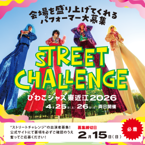 びわこジャズ東近江では今年も市役所前に設置予定の歩行者天国ゾーンにてパフォーマンスをいただくパフォーマーを募集します。